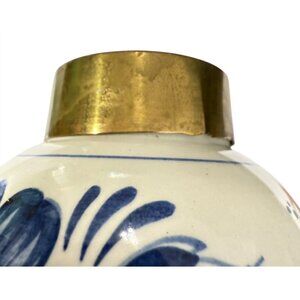 This hand-painted ceramic vase features a classic Delft Holland blue and white floral design, complemented by a polished brass rim. A timeless decorative piece. RARE