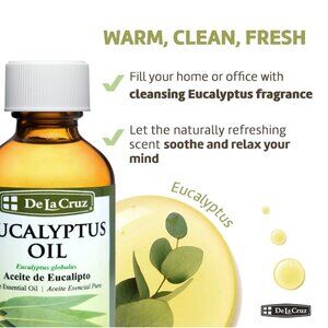 De La Cruz’s eucalyptus essential is a fragrant, refreshing and earthy essential oil for your diffuser that stimulates your senses and recharges your mind, body and spirit. Whether your home or office needs refreshing or you could simply use a pick me up, just a drop or two of our pure eucalyptus essential oil in your aromatherapy diffuser or humidifier can help revitalize your mood.
