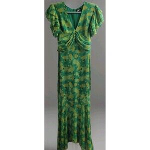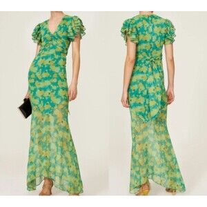 De La Vali Palmera Green Floral Chiffon Maxi Dress UK 12 US 8 Ruffle Sleeve $676