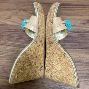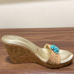 De Martino Capri cork wedge sandal. Leather strap across vamp decorated with turquoise and gold beads. Leather lining and rubber sole. Size 38. Made in Italy.