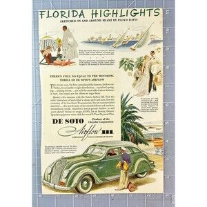 De Soto Airflow III "Every Car should have De Soto Safety " Florida Highlights Sketched. Vintage Print Ad 1936 National Geographic Magazine 1936, About 10 x 6.5 Inches. Carefully shipped.