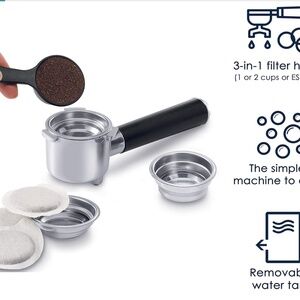 ONE ESPRESSO SHOT OR TWO? The three-in-one filter holder accommodates the included filter baskets for single espresso, double espresso, and easy-serve espresso pods – whatever your preference.