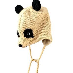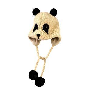 DeLux Nepalese Hand Knit Panda Bear Beanie Kids M/L Ear Flaps White Wool Vintage