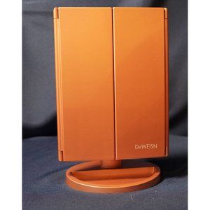 The DeWEISN tri-fold lighted vanity mirror is a popular makeup mirror that has 21 built in LED lights, touch screen, and 3X/2X/1X magnification. It is designed to adjust brightness by touch sensor switch and long press to dim to light. The mirror can be powered by 3 AAA batteries or a Micro USB cord. NOT INCLUDED. The mirror can be rotated 180 degrees and fixed at any position as needed.