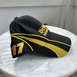 Gently used black and yellow DeWalt racing hat, adjustable.