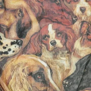 Dead-stock show dog windbreaker in a size small. Dog printed light weight plastic-like fabric. Contrasting black fabric neckline, cuffs, and hemline. If you need a jacket for your next dog show this one will keep you warm.