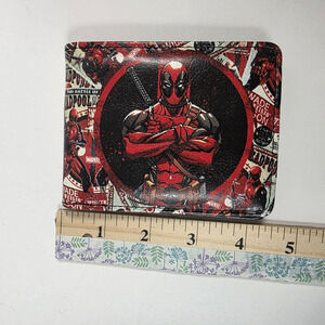 The Deadpool Arms Crossed Pose Badge/Wade Vs Wade Marvel Comics Bi-fold Wallet by Buckle Down is a stylish and functional accessory for fans of the popular comic book character. Made of faux leather with multicolor accents, this wallet features the iconic Deadpool logo and is designed in a bifold style for easy use. With credit card slots and a folding design, this wallet is perfect for anyone who loves the Deadpool comics and Marvel universe.