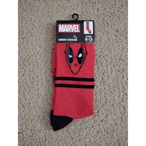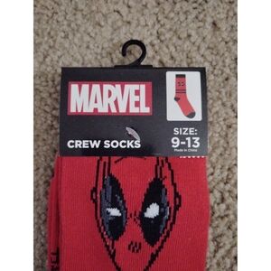 These are a pair of Marvel-themed crew socks featuring the popular anti-hero, Deadpool. The socks are primarily red with a large, detailed graphic of Deadpool's masked face on the front. They also feature two thick, black stripes circling the leg. The heel and toe sections are also black.