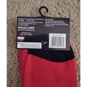 The socks are a men's size 9-13 and are officially licensed Marvel merchandise. The tag indicates they are manufactured by Equalizer Accessories and are made of 98% polyester and 2% spandex, excluding the elastic. This blend suggests they are soft, comfortable, and have a good amount of stretch.