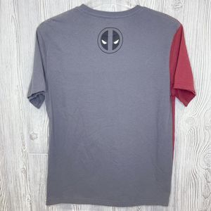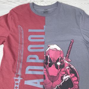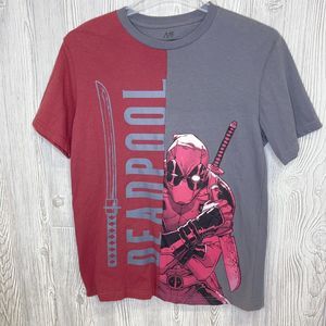 Deadpool T-Shirt by MF Two Tone Gray Red Spellout Sword Men's Medium Marvel Nice! The pit-to-pit measurement is approximately 20 inches. The length measurement is approximately 28.5 inches. Measurements taken from the outside front of the garment. The condition is Used. This shirt is in good used condition. There are no rips, holes, stains, or tears. See photos for details.