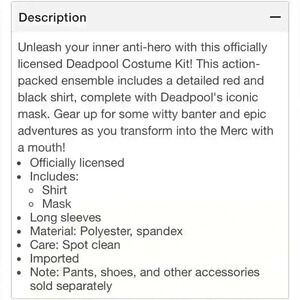 Deadpool costume never opened or worn (kid pool) adult men’s costume comes with shirt and mask only