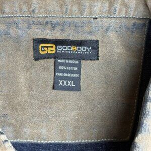 Rare and unique GodBody DenimTechnology men’s jacket in distressed brown cotton. Features a rugged faded wash with button-front closure, two chest flap pockets with zigzag stitching, adjustable cuffs and hem, and signature GB metal logo plate on the back. Oversized XXXL fit makes it a standout streetwear piece.