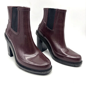Deadstock Hunter Maroon on Black Block Heel Patent Rubber Ankle Boots Women's 7