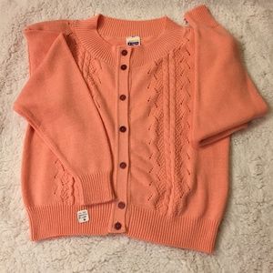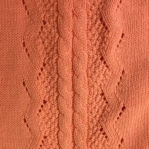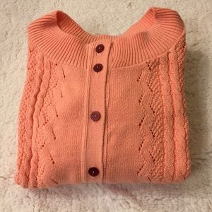 1989 Montgomery Ward Vintage beautiful salmon colored cardigan! Combination of cable & rib knit stitches. Sewn shoulder pads. Rock those cool Fall or Spring days! A new favorite all year round. Dress it up or dress it down. YOU will be the center of attention. This new treasure can be yours! AMERICAN WEEKEND Brand. Made in the USA. 100% Cotton.