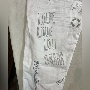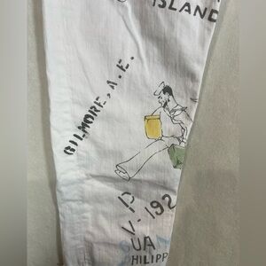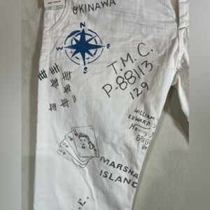 White pants featuring blue and gray graphic prints. Ideal for casual outings.