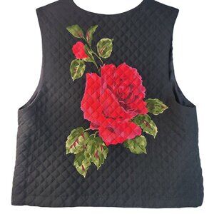 Susan Bristol Winter Rose Quilted Vest Floral Button Front Black Size 8