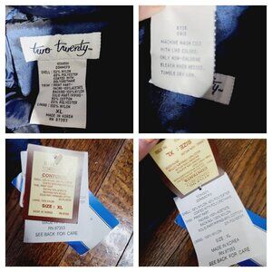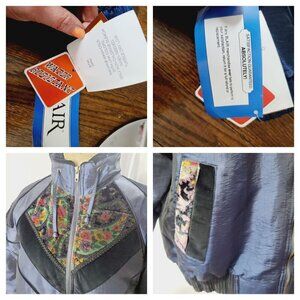 DETAILS: Glam floral printed metallic blue puffer jacket. Zip front closure and high neck. Made in Korea. Original tags.
