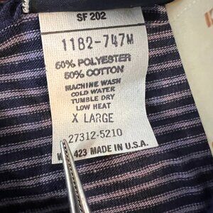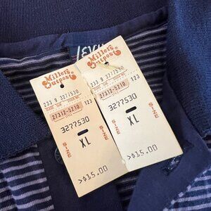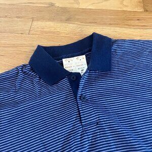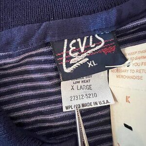 This is an awesome DEADSTOCK NEW WITH TAGS Vintage 80s Levi's Blue Striped MADE IN USA 50/50 Polo Shirt in a size Men's XL, although it fits a modern Medium/Large best. It has super short sleeves and is 50% Cotton / 50% Poly. Very cool!