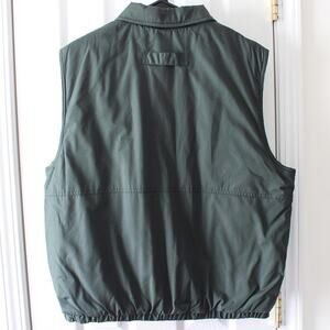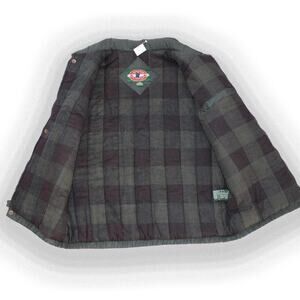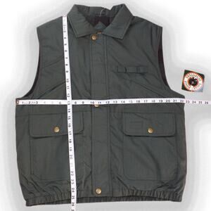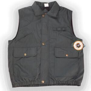 Lined with a dark green plaid fabric, would be great for fishing, Original tags still attached, in amazing vintage condition never used, cloth / cotton type outer material. Tagged Men's Large. Darker pine green colored in natural lighting. Not heavy at all but a bit heavier than a typical vest due to lining.