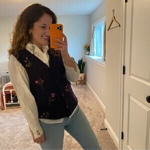 I am so in love with this stunning new with tags deadstock vintage European brand Tulchan white floral needlepoint floral embroidered button front collared top with matching embroidered soft sweater vest