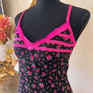 Deadstock Y2K Hot Pink & Black Floral Lace Babydoll Mini Dress Lingerie Top S