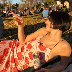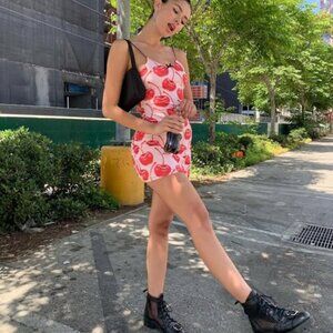 Deadstock, sold out, OMIGHTY cherry dress. Reposhing .. sad cause it’s so cute but the hips are to big for me. Size M OMIGHTY bodycon, stretchy, sexy, cherry print dress. 70% cotton, 30% spandex. Black bow detail, elastic super skinny spaghetti straps. Double lined, great shape some loose seams but barely noticeable. Additional info from original seller in pictures. 22 in long on the back, 26 1/2 in long in the front, 14 1/2 pit to pit, 13 1/2 in chest, 14 in waist, 17 1/2 in upper hips, 20 in lower hips, 20 1/2 bottom opening.