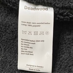 Sustainable and edgy, this Deadwood biker jacket is crafted from 100% recycled leather with a cozy faux shearling lining and collar. Designed in Sweden, this jacket features an asymmetrical zip front, zippered pockets, and silver-tone hardware for a classic moto look.