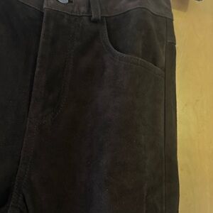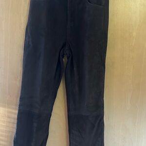 They are crafted from premium upcycled suede. These relaxed bootcut pants offer a mid-high waist and classic jean-style waist and back pockets, blending timeless style with sustainability. Made for those who seek both comfort and an edge, these leather pants are designed to last.