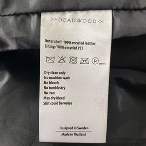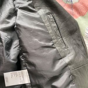 Made from recycled leather. Zip front w/buckle closure. 4 Exterior pockets and 1 interior. Fully lined. Zipper detail on sleeves. Size 38