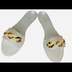 White flat jelly sandals with gold Cuban like chain link.