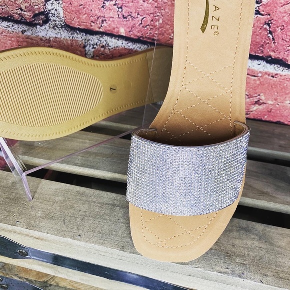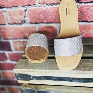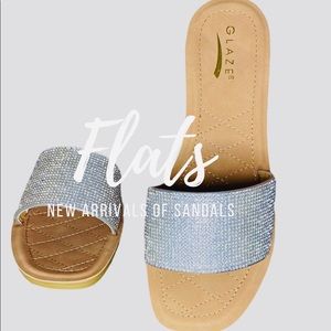 Silver rhinestone flat sandals with soft flexible sole for comfort. True to fit for some. My not be as wide for some feet.