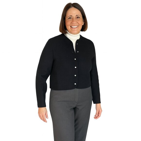 Wrap yourself in timeless elegance with this Dean of Scotland 100% wool jacket. Perfect for layering, this women’s size large cardigan-style jacket combines refined structure with everyday comfort. Featuring pearl-like buttons and ribbed sides, this versatile piece transitions seamlessly from casual errands to cool-weather outings. A must-have for lovers of heritage style and premium materials.