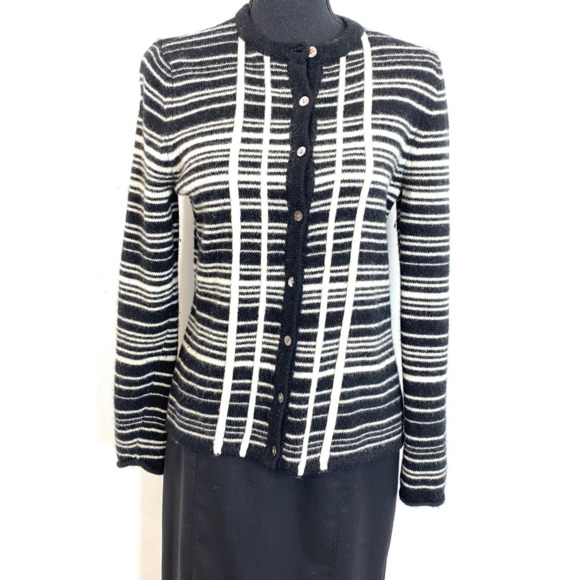 Deane & White Lambswool Black White Striped Button Front Cardigan Small