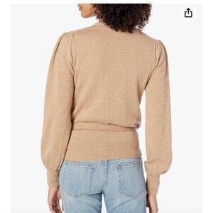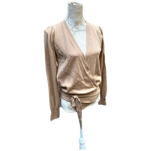 Dear Drew by Drew Barrymore, cashmere wool wrap top, beige wrap sweater, tan wrap blouse, merino wool top, luxe knitwear, quiet luxury, minimalist chic, neutral sweater, soft cashmere blend, adjustable wrap, long sleeve knit, timeless classic, elegant casual, weekend luxe, cozy wrap top, feminine knitwear, gathered sleeve detail, imported designer top, elevated basics, size medium
