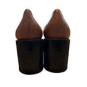 Dear Frances Chunky Loafer Heels are a pair of women's shoes with a brown leather upper material and a pump style. They have a chunky heel and a loafer design, making them a unique addition to any outfit. The shoes are available in US size 7.5 and EU size 38.