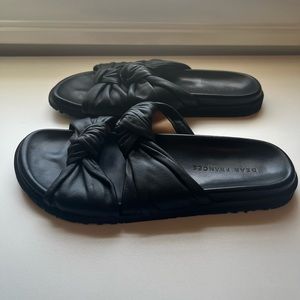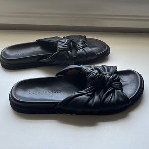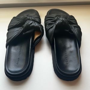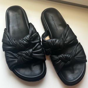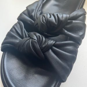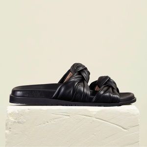 Made by hand in Italy, our Tye Slides showcase a combined sense of modernity and elegance. Crafted in supple Italian leather with twin knot straps across the bridge and set on a grounding rubber sole, they are the ultimate in every day chic. Wear them to ground wispy dresses and with denim on Sundays.