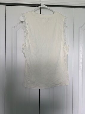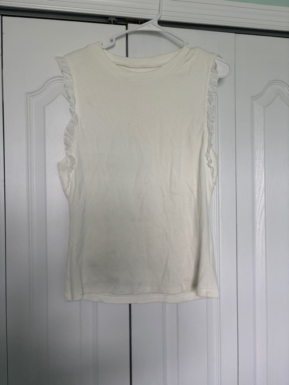 Cream knit tank with subtle ruffle trim at the shoulders. Sleeveless design for warm-weather layering. Clean, feminine silhouette for everyday wear.