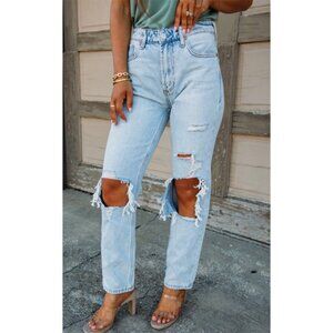 High rise cropped straight leg jeans. It's the friendly fit that sits at natural waist and fitted slender from the hip to mid thigh. Cropped inseam on rigid (non-stretch) denim accented with designer placed destructions, kneed cut-out & tears, busted knee rips, grindings on waistband & leg opening.
