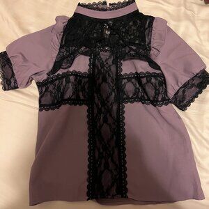 Dear My Love Purple and Black Lace Cross Ruffle Short Sleeve Blouse