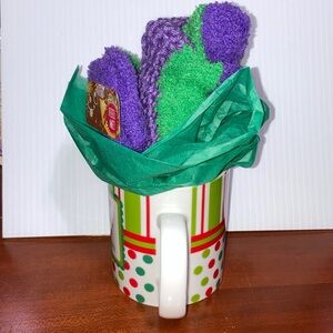 The mug and socks come wrapped in a clear plastic gift bag with a gift tag