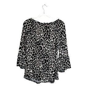 Dear Scarlett Leopard Print Off Shoulder Peasant Top in Gray & Black with Tiered 3/4 Length Bell Sleeves. Lightweight with Lots of Stretch. Elastic Neckline Can Be Worn on or off the Shoulders. Women’s Size L Flattering Relaxed Fit! Easy Wash & Wear No Iron Style
