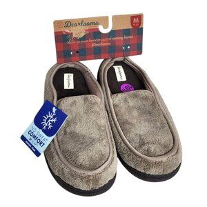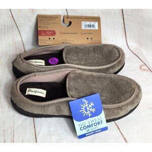 Dearfoam memory foam slippers in Fossil color, medium US 9-10, breathable no-sweat design, easy slip-on, machine washable for easy care