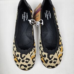 This is a NEW IN THE BOX pair of Dearfoam Misty Ballet Flats in a Leopard Print. These shock-absorbing shoes offer plenty of arch support for those extra-busy days. They are machine-washable. A flexible and breathable knit upper with scalloped details hugs your foot for the perfect fit. The molded soft rubber outsole provides durable traction, stability, and flexibility. Women's Size 8.