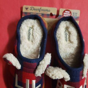 Dearfoams Cozy Comfort Lil Bear Plaid Clog Slippers women's size 5-6 Made with little bears of all sizes in mind, these charming slippers are a must for cozy nights in with the whole family. Cushioned memory foam insoles and supersoft lining offers constant comfort, while the charming designs look perfect next to the other members of our Matching Family Collection. With styles for Papa Bear, Mama Bear, Lil Bear, and Baby too - everyone can get comfy together!