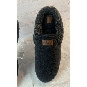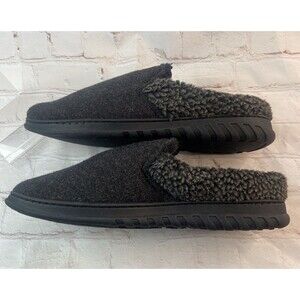 Comfortable Dearfoams mens clog slippers in dark gray with plush faux-fur lining and a cushioned memory-foam style footbed. Features a durable indoor/outdoor rubber sole for versatile wear. Size Large (Mens 1112). Clean and in good pre-owned condition with normal light wear on soles (see photos).