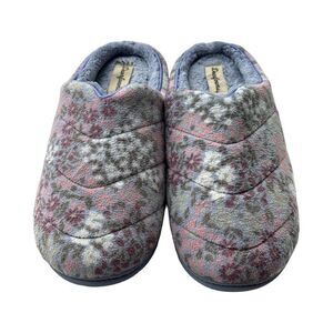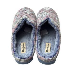 Soft and comfortable slippers by Dearfoams. Features a plush interior and stylish pattern. Euc. Plush.