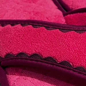Experience ultimate comfort with these Dearfoams pink plush slippers, designed with a cushioned footbed for cozy lounging. The vibrant pink color is complemented by a purple dark trim, adding a stylish touch to your indoor footwear. Perfect for relaxing at home.