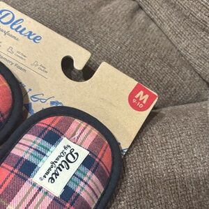 Cozy slippers with a plaid pattern. Features memory foam for comfort.