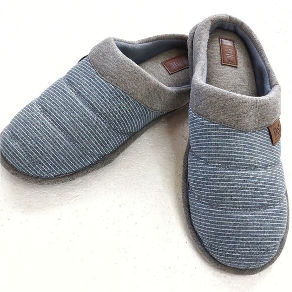 Dearfoams Slippers M 9-10 Slip On Memory Foam Blue, Gray NEW w/o Box. Rubber soles for in or out.