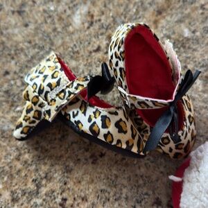 earfoams, mudpie, & misc set of 3 baby girl booties. 2 fleece/fleece lined. 1 animal print faux high heels with velcro strap. New, no tags. Nonsmoking home.  E